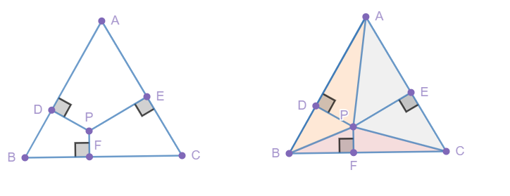 在等边三角形内任意一点P跟三边的垂直距离之和,等于三角形的高。